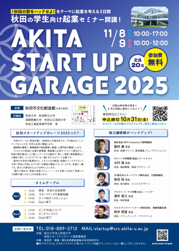 秋田市とJR東日本グループの強力なバックアップをいただき、「秋田の駅をハックせよ!」をテーマに秋田の学生向けセミナー「AKITA START UP GARAGE 2025」を開催します。